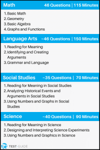 Social Studies | 35 questions | 70 mins | Knowledge of US history, geography, civics, government, and economics |